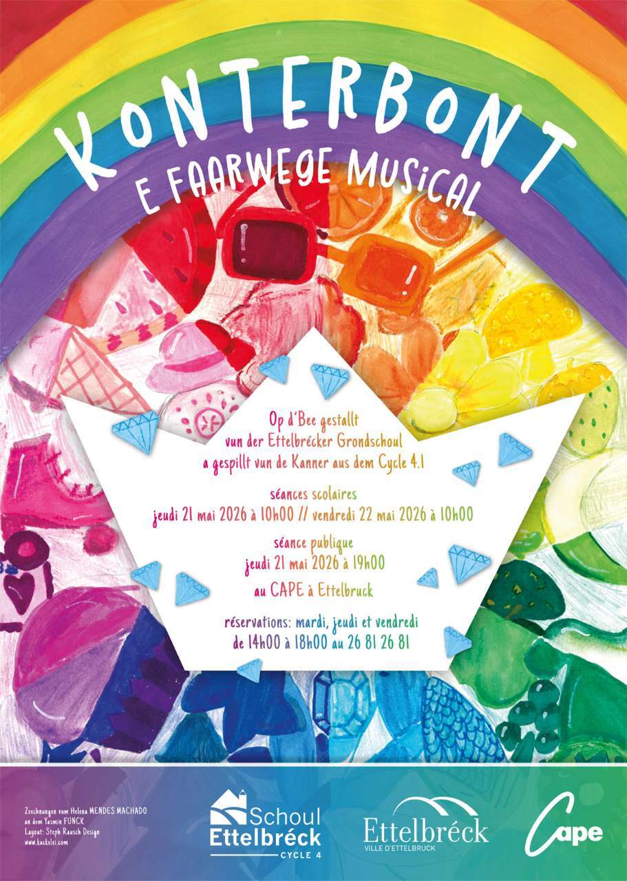 Eng ronn 90 Kanner aus dem Cycle 4.1 aus der Ettelbrécker Grondschoul hu mat vill Motivatioun an Ausdauer Lidder, Dänz an Theater astudéiert fir dëse faarwege Musical op d‘Bün ze bréngen.